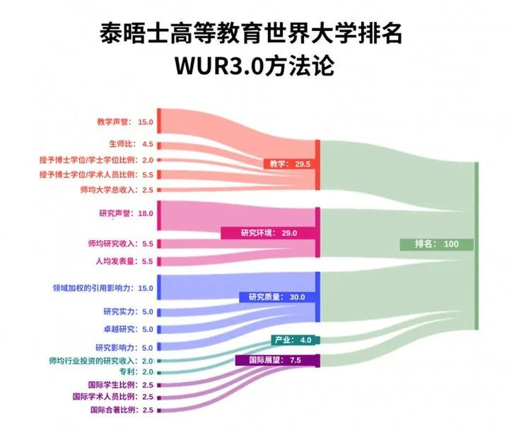 可以看出泰晤士高等教育世界大学排名看重的是教学、研究环境、研究质量这三个指标,总占比接近90%。
