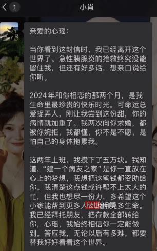 “我知道,建一个‘病友小家’是你一直放在心上的梦想,多希望这个小家能帮助更多人。”肖先生在遗书中写道,“答应我无论以后有多难,都要替我好好看这个世界。”胡心瑶也决定完成肖先生的遗愿,目前她已经在筹备“病友小家”,将在2025年10月底开放。